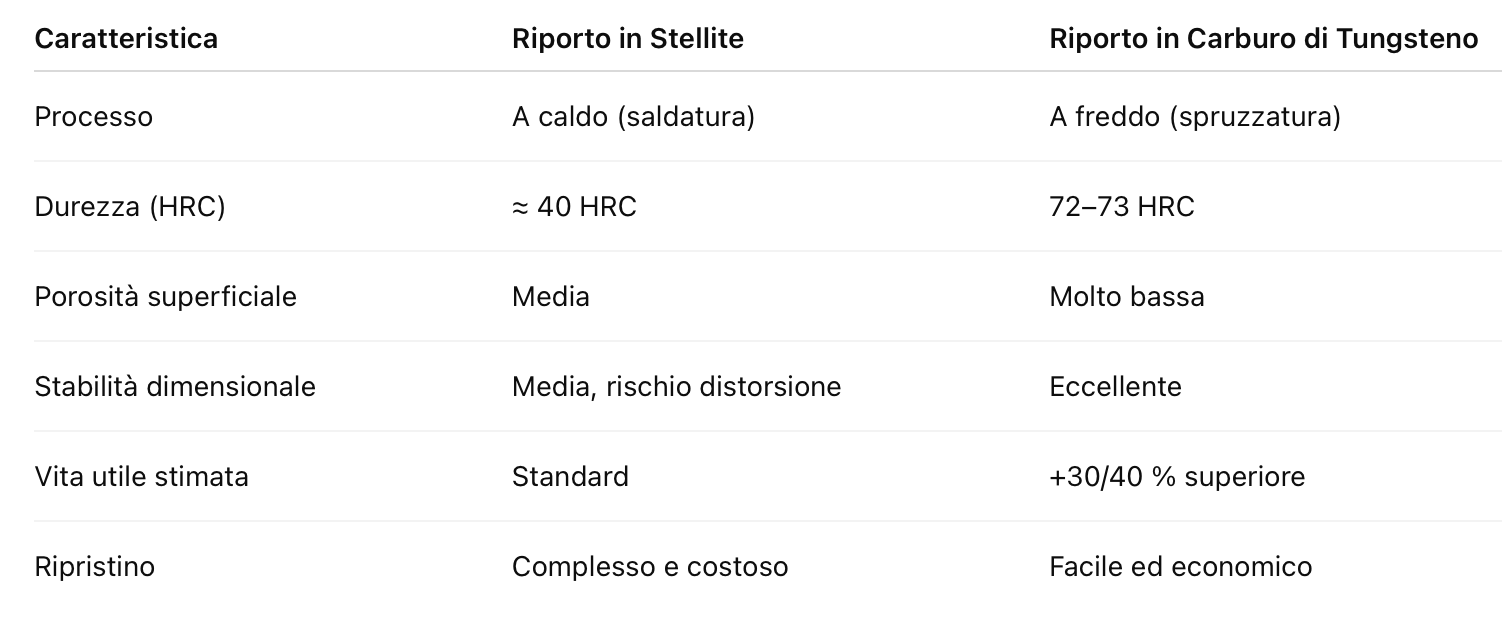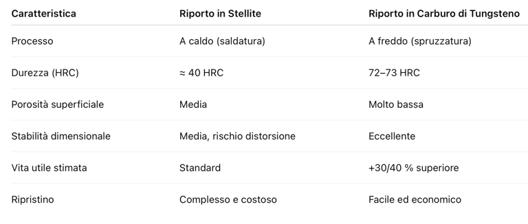 Il Carburo di Tungsteno con aggiunta di Cobalto e Cromo rappresenta la tecnologia di riporto più avanzata oggi disponibile.